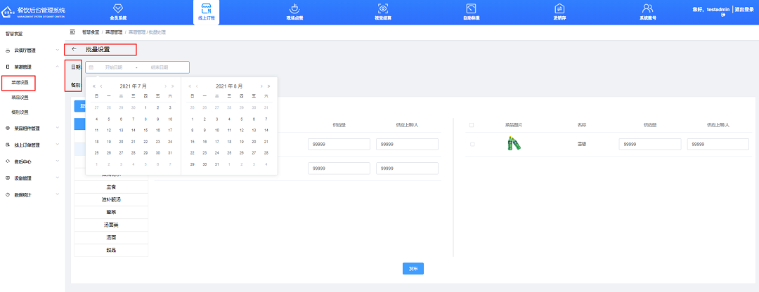 ①點(diǎn)擊“批量設(shè)置”按鈕,可進(jìn)行批量排菜。例如:12月2號(hào)至6號(hào)(周一至周五)的晚餐,要排的菜都是相同的,就可使用此功能選擇對(duì)應(yīng)日期段后批量發(fā)布。