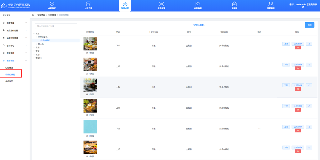 ①點擊“上架”或“下架”按鈕進行上下架操作(上架即設備展示該輪播圖組,下架即隱藏),可設置上下架時間及可顯示餐別。
