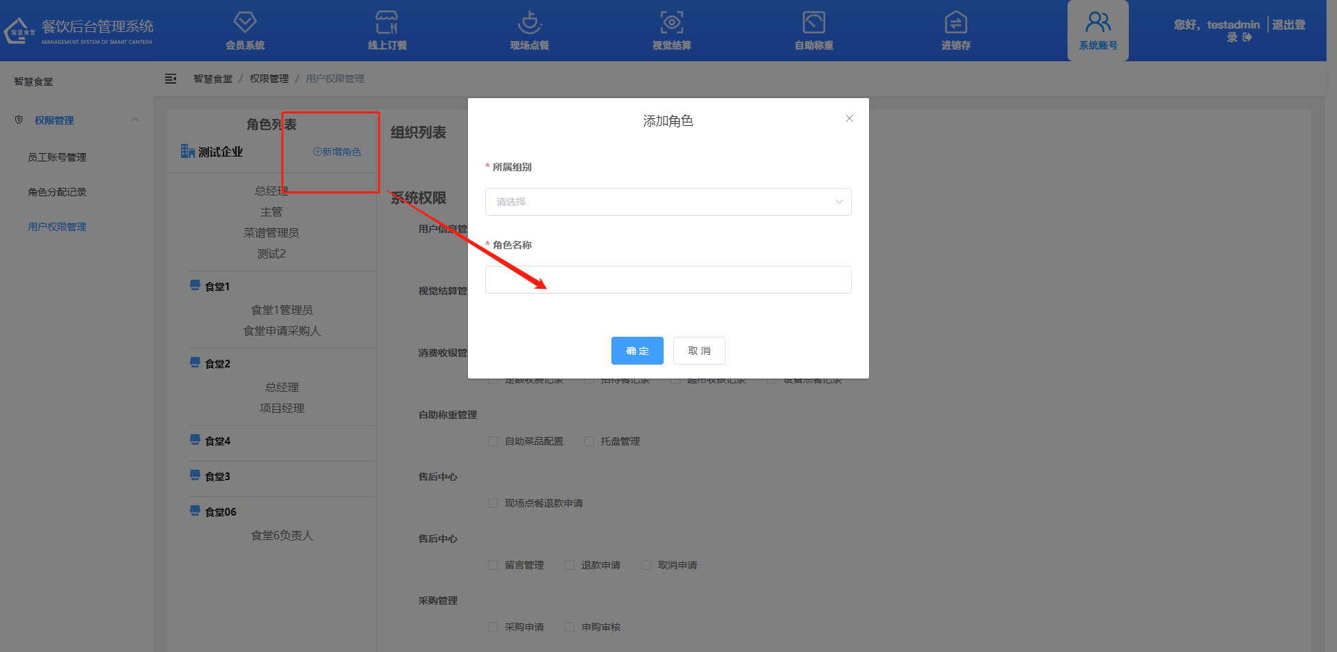 列表按不同食堂顯示角色名稱,點擊任意一個名稱,可對角色權限進行修改。