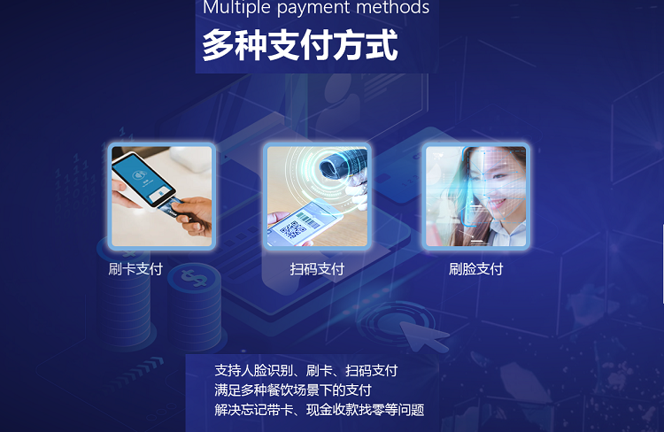 戈子科技智慧食堂可對接食堂一卡通系統,實現刷卡支付;為滿足現代人消費習慣,戈子科技智慧食堂可使用微信、支付寶等掃碼支付;戈子科技智慧食堂同時擁有先進的金融級AI人臉識別技術,員工在后臺錄入自己的人臉信息后即可使用人臉識別支付,人臉識別支付人均用時低于0.3秒,體現該技術的超高速識別。多種方式聚合支付的方式大幅度降低了就餐高峰期時的排隊等待壓力,總體提升企業食堂運營效率,提高員工就餐的便利性。