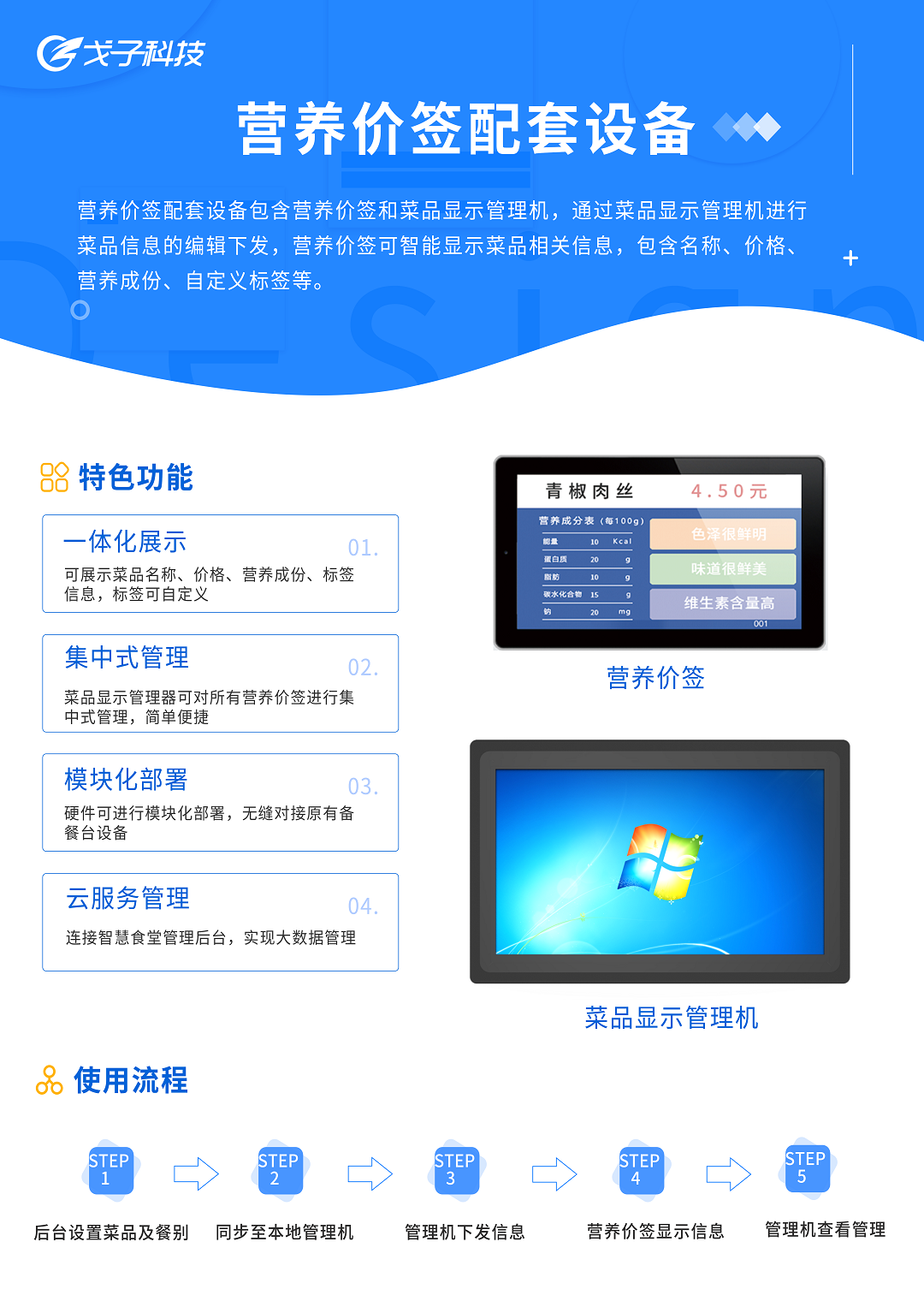 戈子科技的電子菜價標簽主要是嵌入在智能備餐臺內,將展現對應菜盆售賣菜品的品名、價格、營養標簽和營養成分等情況。